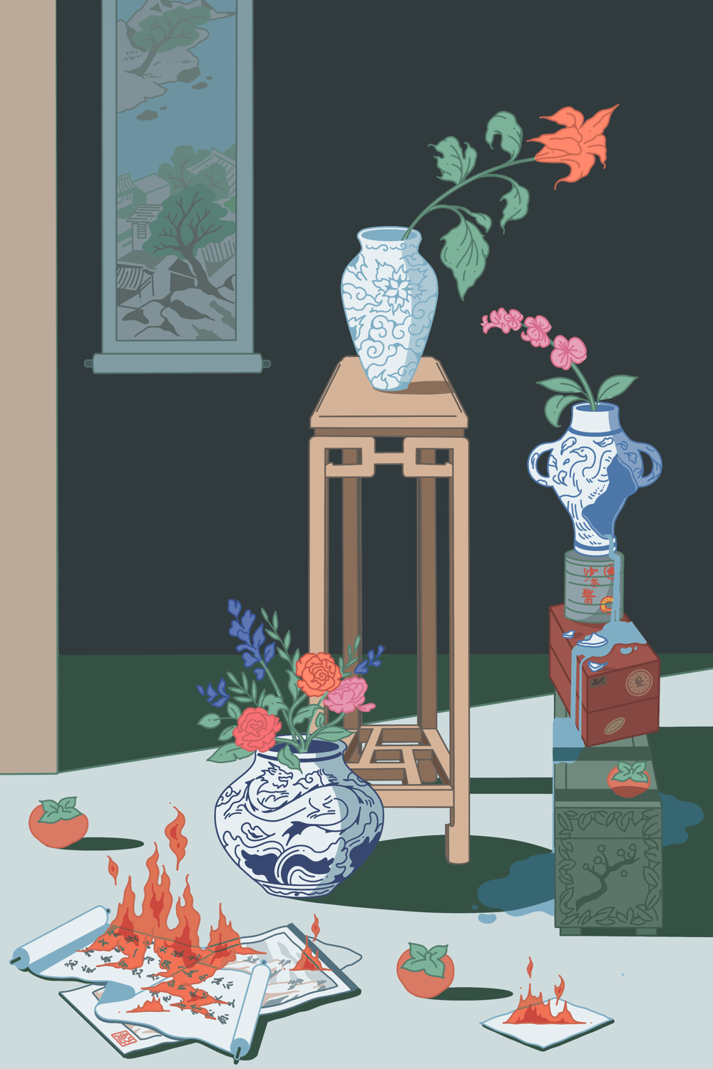 12x18" matte poster. Still-life inspired by Paul Wonner's 1983 "Dutch" Still Life with Orchids, Postcard View of Paris, and "Death of Marat".